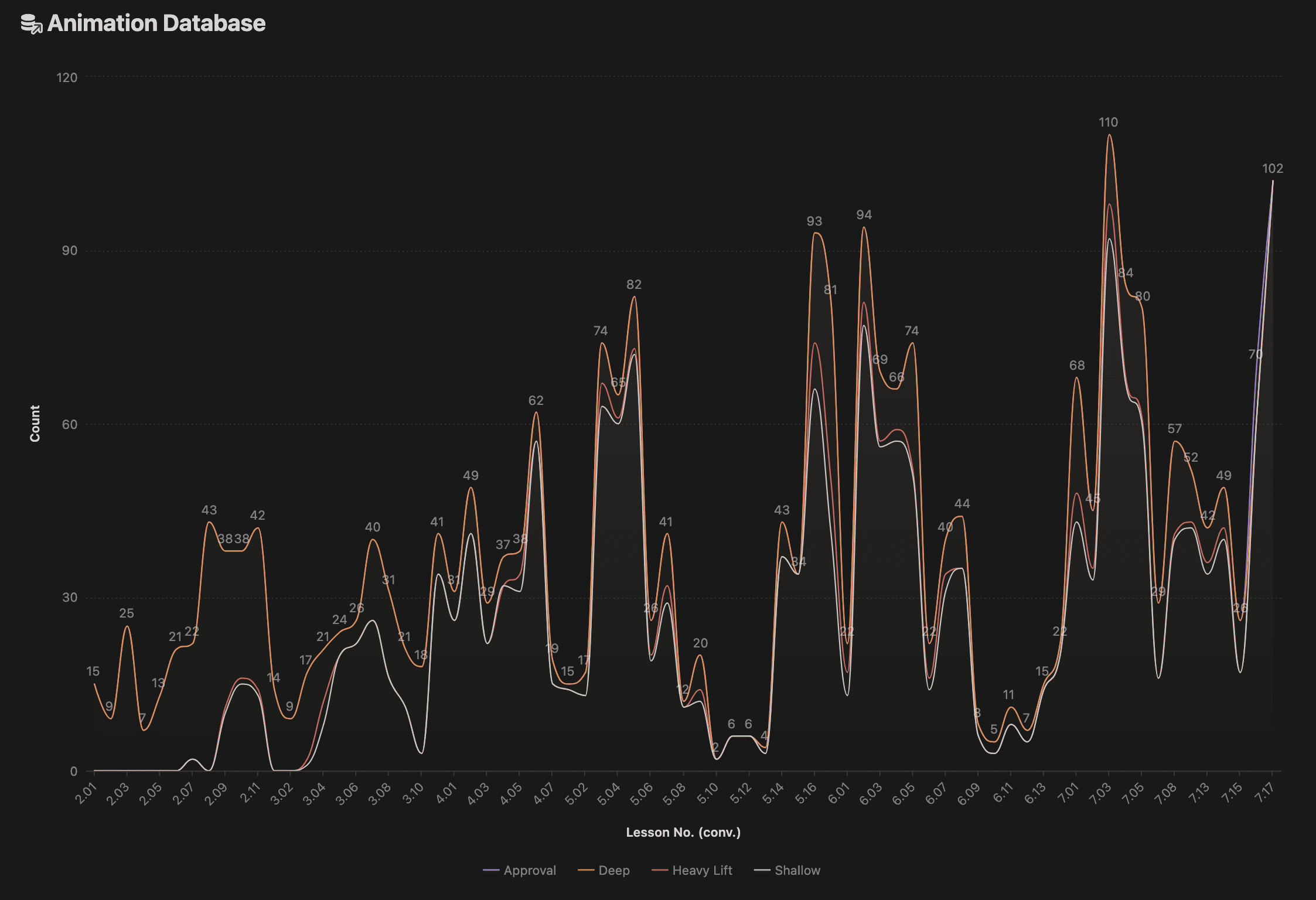 Below is a graph of all the animations created so far, broken down by animation complexity (y axis) and lesson (x axis).